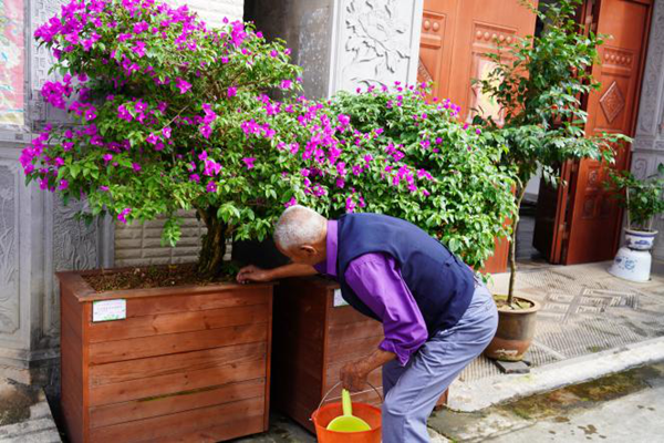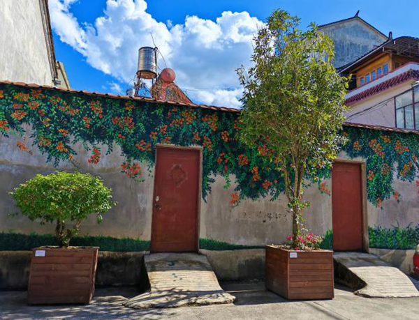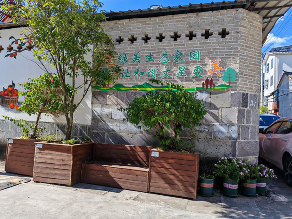 小区内青砖瓦房、木质门楼、庭前照壁、火山石围栏等处处彰显腾冲传统建筑文化。各家各户庭院打理得干净整洁,花草树木种植都独具特色、布局合理、色彩丰富。做到家门外有树,家里面有花草,打造了一户户院里院外绿美宜居的最美庭院。