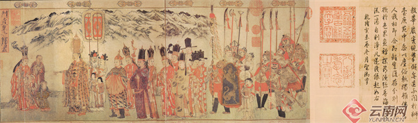 画卷原稿中的“十六大国王众”一图的服饰同样吸引了观众的目光。身着古代大理国友好邻邦传统服饰的表演者惟妙惟肖展示出邻国风情,兴高采烈的来大理奔赴一场隆重的盛会,组成一幅美美与共的团结画面。