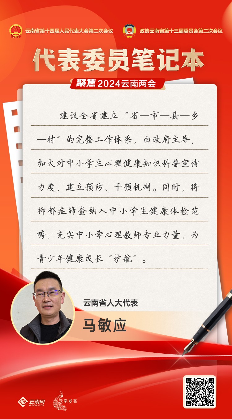 “近年来,中小学生群体心理健康问题日益突出,且呈低龄趋势。”作为一名从事教育工作24年的基层代表,省人大代表,会泽县实验高级中学校长、党委副书记马敏应对于青少年心理健康一直高度关注。