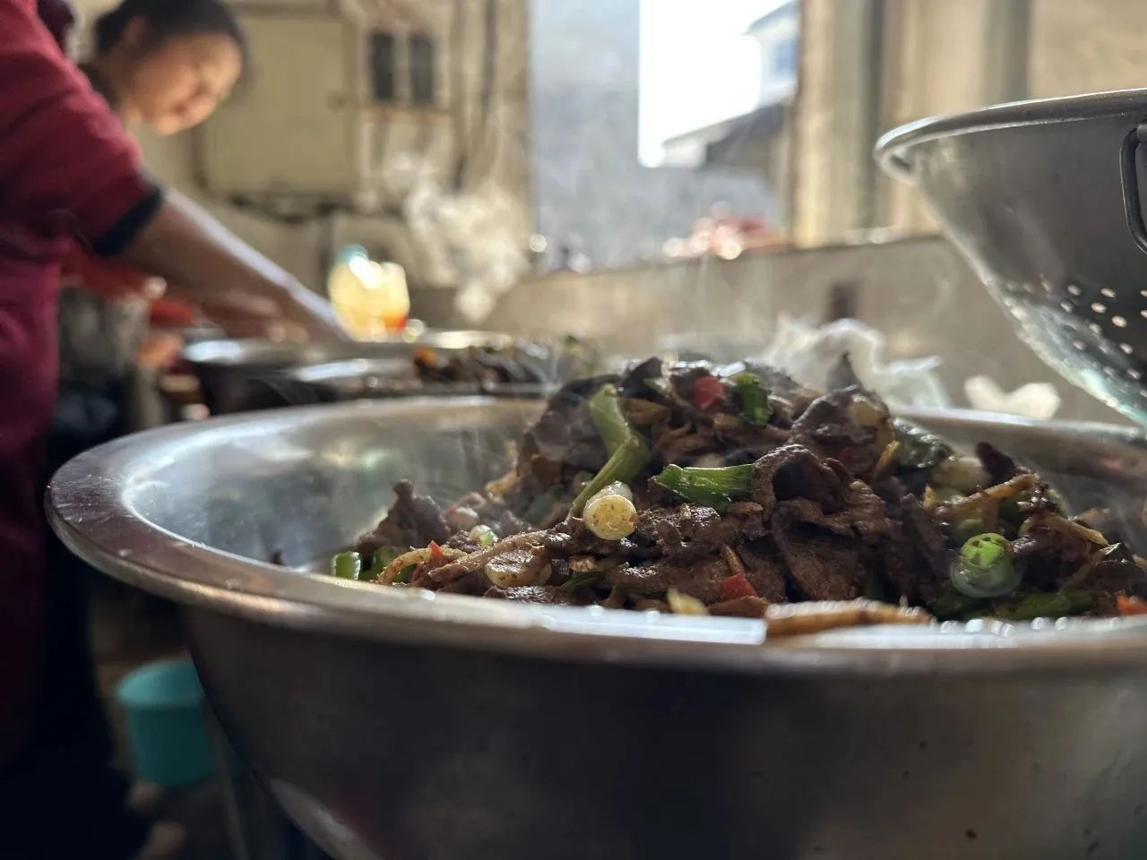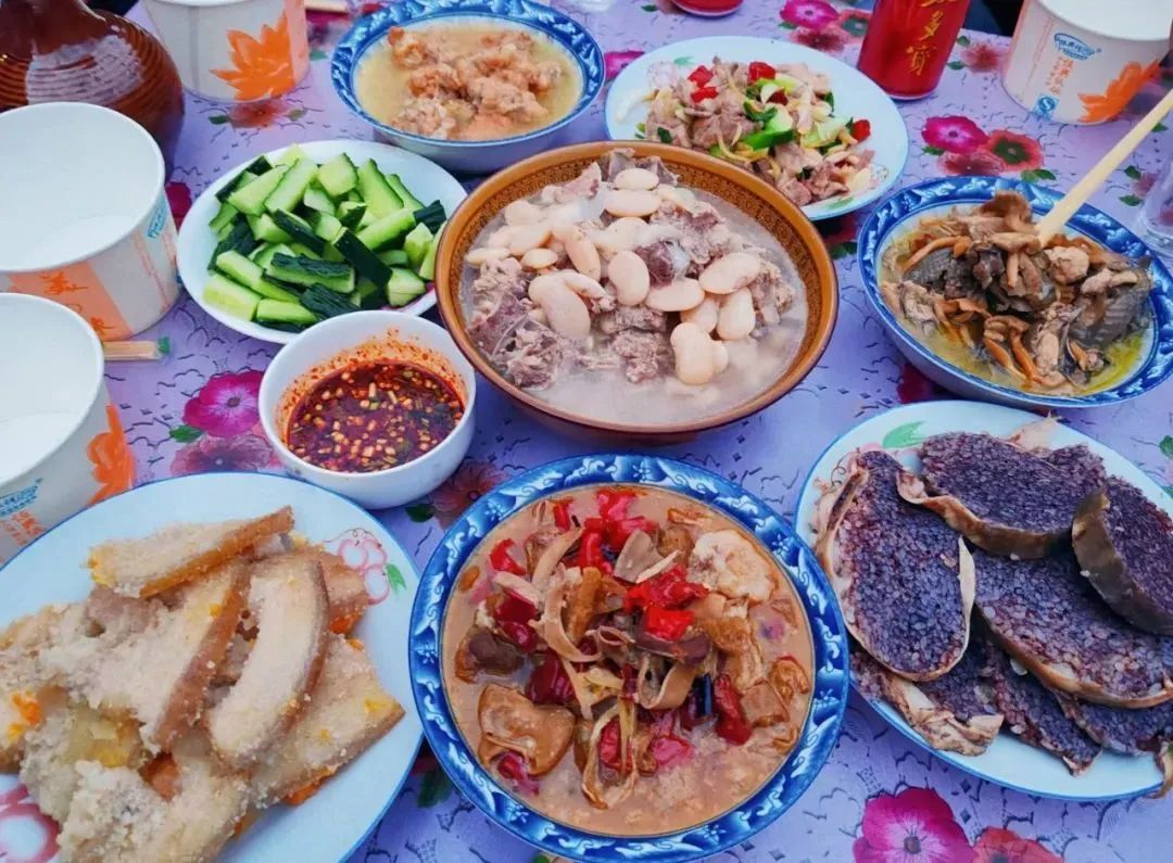 刚出锅的米灌肠、江边辣、小炒肉、心肺汤……一头猪的使命在杀猪饭的餐桌上完成。丽江市文化和旅游局 供图