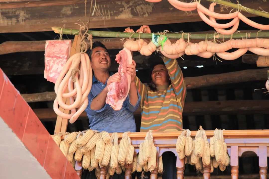 在保山市腾冲市五合乡,农户将新分割下来的猪肉串起来。腾冲市融媒体中心 供图