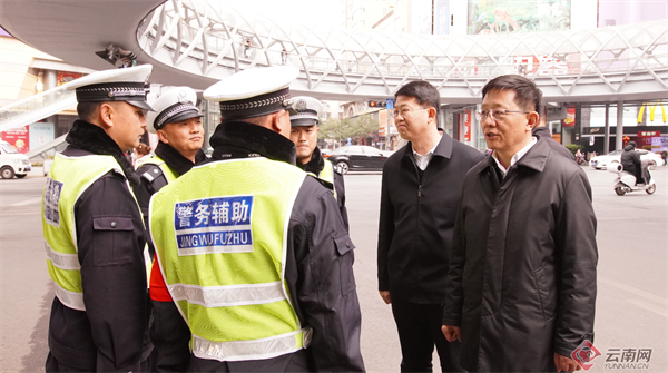 昆明市公安局交警支队一大队值守的小花园路口交通疏导任务繁重。王予波到现场看望民警辅警,充分肯定全省交警系统为推动交通安全形势稳定向好所作的贡献。在省政府五华山机关安保中心,他通过视频向全省值勤公安干警、武警官兵、消防指战员表示问候,希望大家忠于职守,有力维护社会稳定,护航高质量发展。