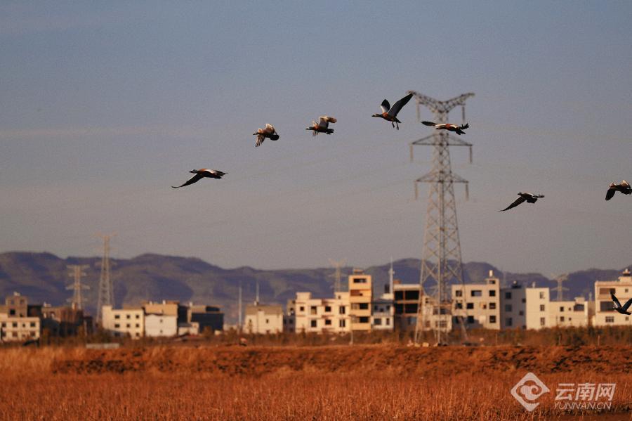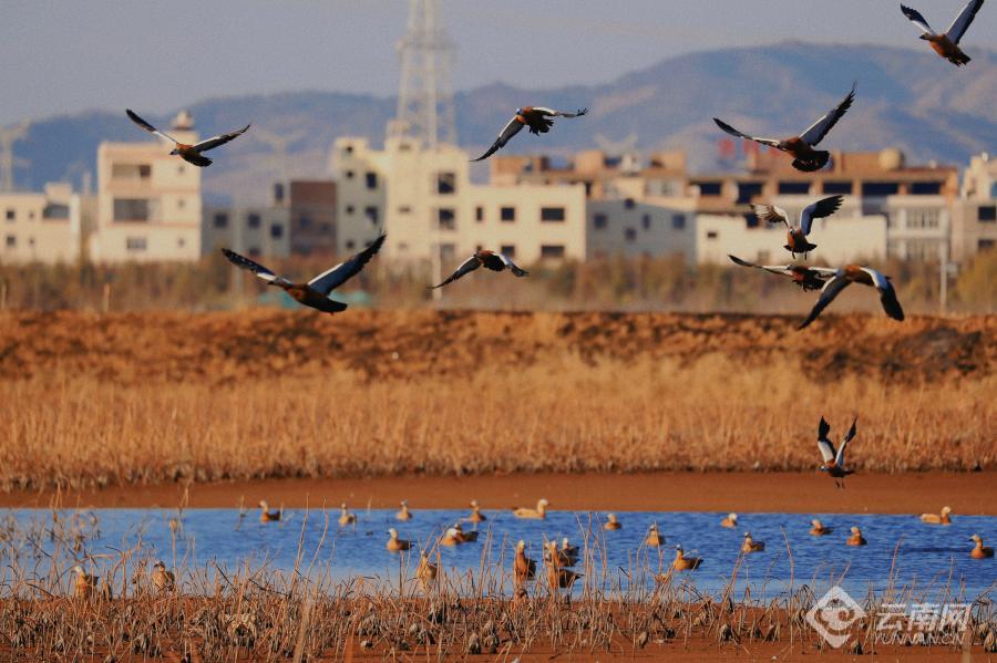 赤麻鸭是国家二级保护野生动物,为迁徙性候鸟。每年入冬之际,成百上千的赤麻鸭都会来到昭阳区越冬,荷田、水库成了它们的“乐园”。