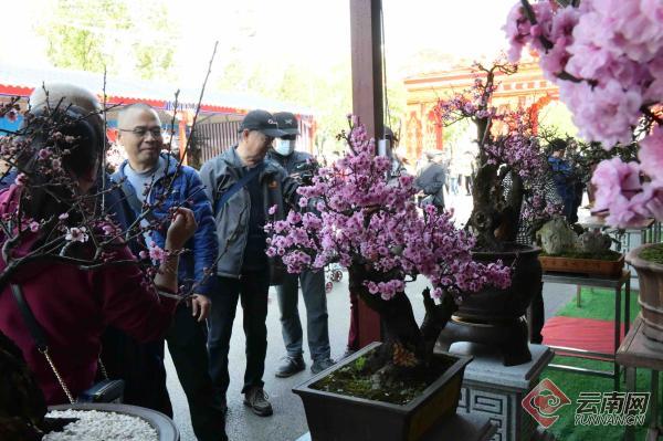 位于花街正中的舞台上歌舞升平,花街上游人如织。喷水的彩龙、逼真的孔雀、金黄的锦鲤……各式各样的彩灯造型纷纷亮相,剑兰、梅桩、松柏……造型各异的花桩盆景暗香浮动,吸引不少游客拍照打卡,处处一片喜庆的热闹景象。