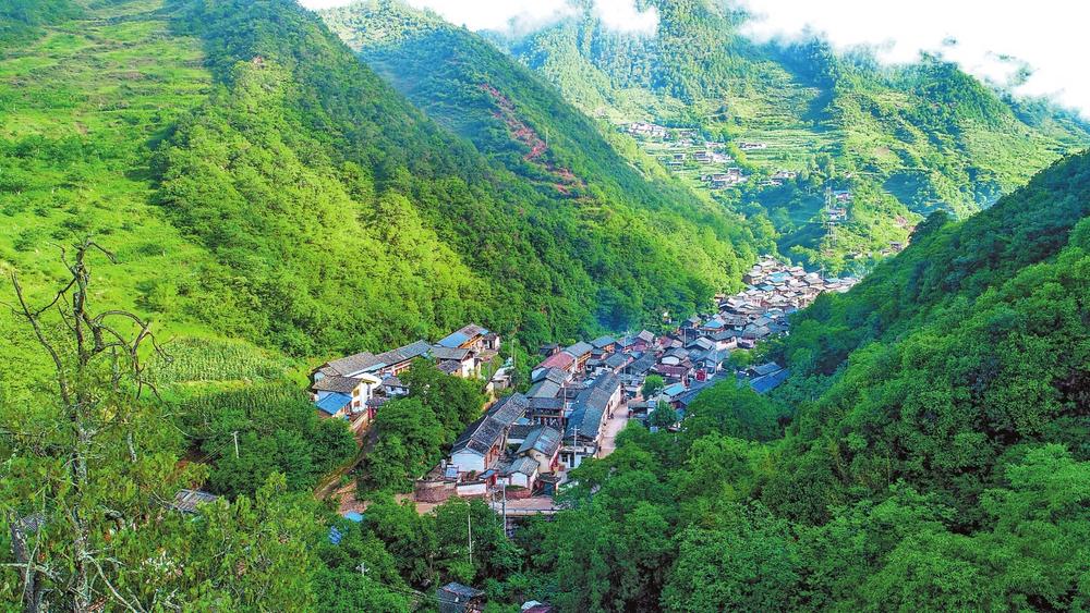 群山围绕、一河穿村,千年古柏枝繁叶茂、高耸入云,桔梗、桃树扮绿山野,四十里箐湿地牛羊成群,让人流连忘返。这里便是共兴村,一个被时光封存、耐人寻味的古老村落。