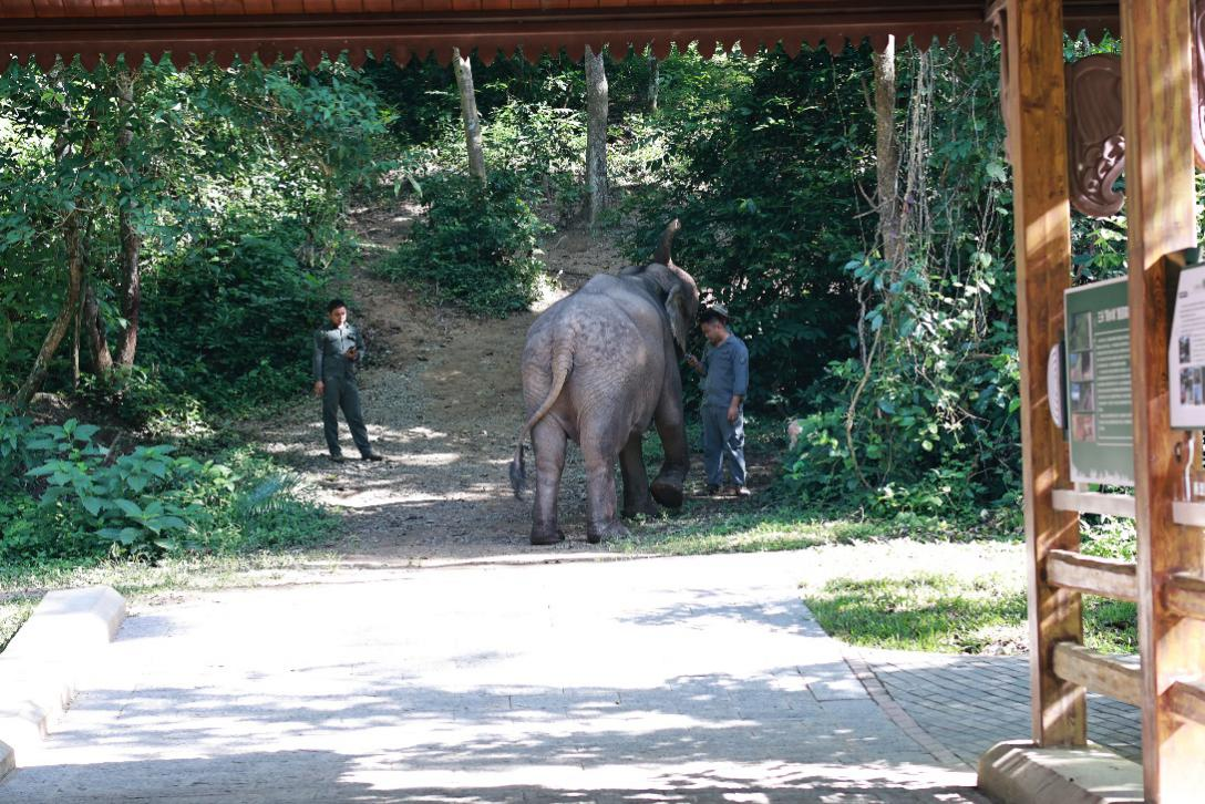 我们到达时,几名工作人员正伴随着一头大象往山谷深处走去,这里植被高挺,阳光透过繁茂的树林,洒下婆娑光斑。“每年十二月到来年二月左右是野生亚洲象出现频率最高的时间段,现在亚洲象基本躲在雨林深处。”一旁的工作人员说道。