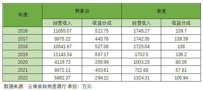 依据西双版纳国家级自然保护区生态旅游管理所提供的统计数据,自2016年至2022年,野象谷景区实现门票收入共计59689.5万元,平均每年达到8527.1万元,生态所收缴上交财税的保护区野生动植物资源保护和管理的收益分成共计2984.5万元,平均每年达到426.4万元;自2016年至2022年野象谷索道门票收入共计9966.38万元,平均每年达到1423.76万元,上缴州财税计797.31万元,平均每年达到113.9万元。