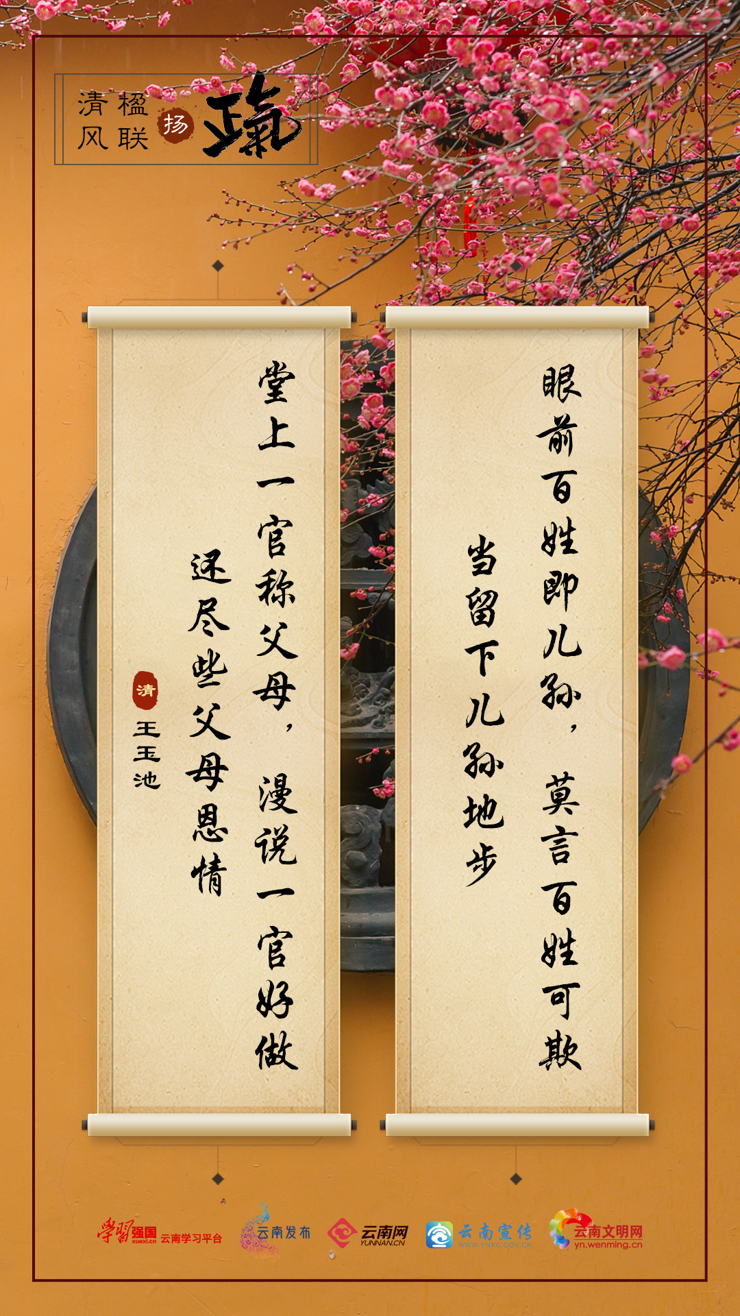 【出处及背景信息】王玉池,清代官员,曾任山东金乡县令。此联是其自撰的县衙大门联,联句写得很富人情味,读之令人心动。据传,王县令在任期间,赈济灾民,断案公允,生活清廉,博得县人爱戴,在旧社会能做到这一点是难能可贵的。
