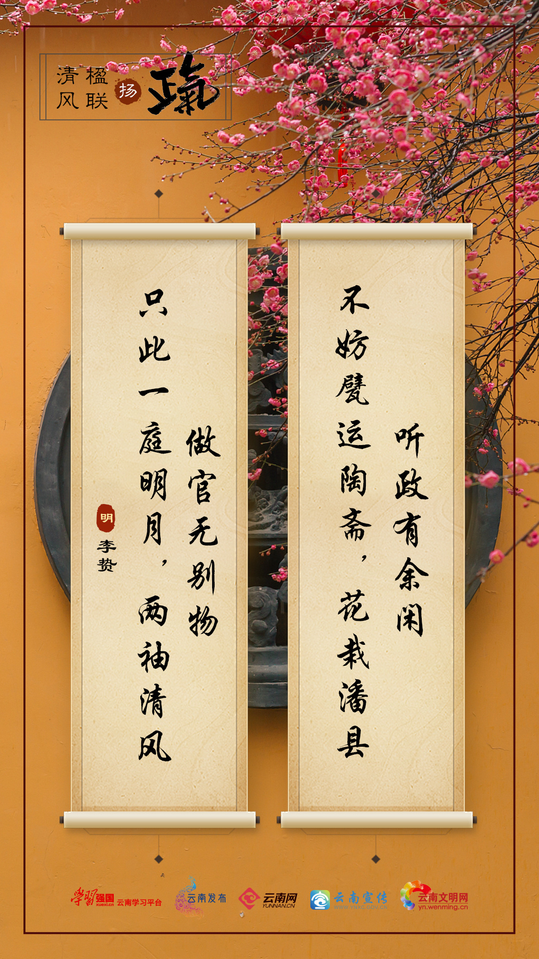 “学习强国”云南学习平台携手云南发布、云南网、云南宣传网、云南文明网,共同推出“清风楹联扬正气”系列策划,精选了一系列中国古代廉洁楹联,旨在通过这些珍贵的文化遗产,传承和弘扬廉洁自律、勤政为民的中华传统美德,为构建风清气正的社会环境贡献一份力量。让我们一同品味这些楹联中的智慧与力量,让廉洁之花在新时代绽放得更加绚烂多彩。