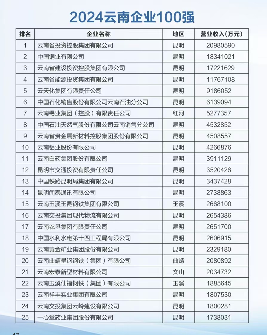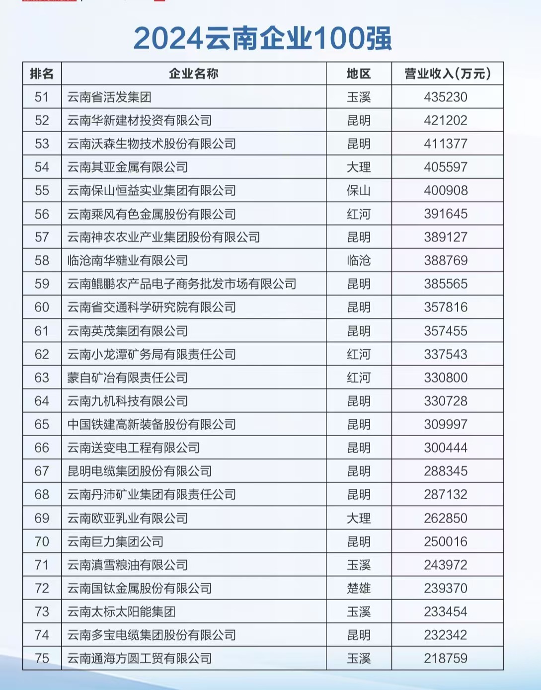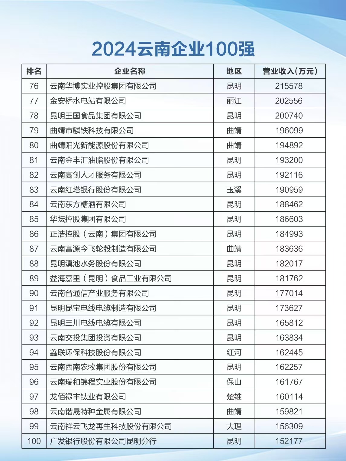 云南网讯(记者 龙彦)11月22日,2024云南企业100强发布会在昆明召开。云南省企业联合会、云南省企业家协会公开发布云南企业100强榜单、云南制造业企业100强、服务业企业50强、高新技术企业100强和云南企业年度营业收入突破亿元企业名单,并同时公开发布《2024云南企业100强研究分析报告》。