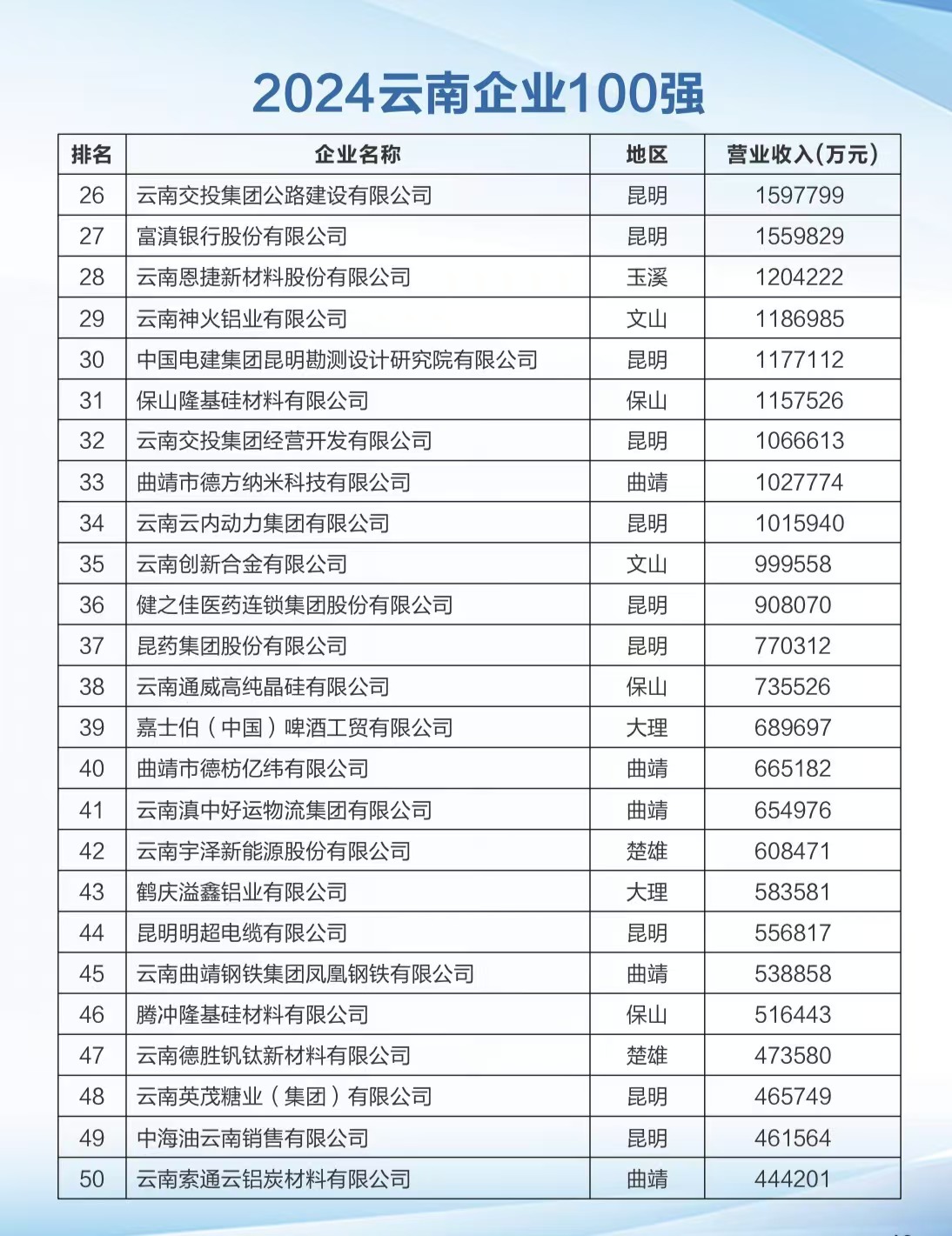 值得关注的是,2024云南企业100强企业名单中出现了云南铝业股份有限公司、云南宏泰新型材料有限公司、云南神火铝业有限公司、保山隆基硅材料有限公司、云南通威高纯晶硅有限公司、云南宇泽新能源股份有限公司、鹤庆溢鑫铝业有限公司、腾冲隆基硅材料有限公司、中海油云南销售有限公司、云南其亚金属有限公司等20家新面孔。