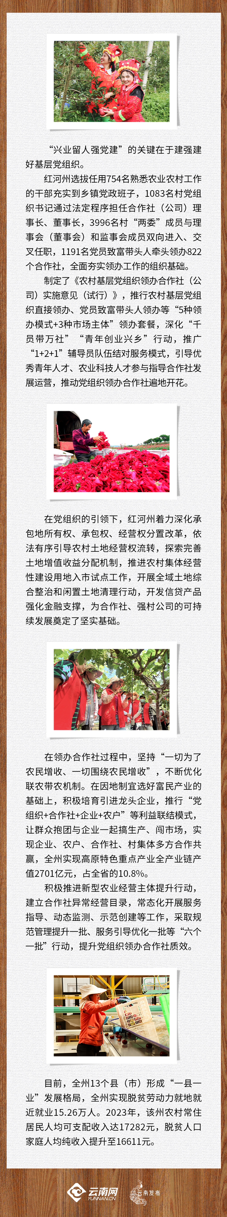 “西北勒模式”的成功,为红河州各地全面推进农村基层党组织领办农民合作社工作提供了有益借鉴。全州依托得天独厚的资源禀赋,充分发挥基层党组织的引领作用,创新探索基层党组织领办合作社模式,在11个重点产业领办成立了4499个合作社、297个强村公司,切实把党组织的政治优势、组织优势和合作社的经济优势、产业优势结合起来,形成企业、产业、就业“三业联动”,走出一条“兴业留人强党建”新路径,实现农民增收、企业盈利、产业发展。