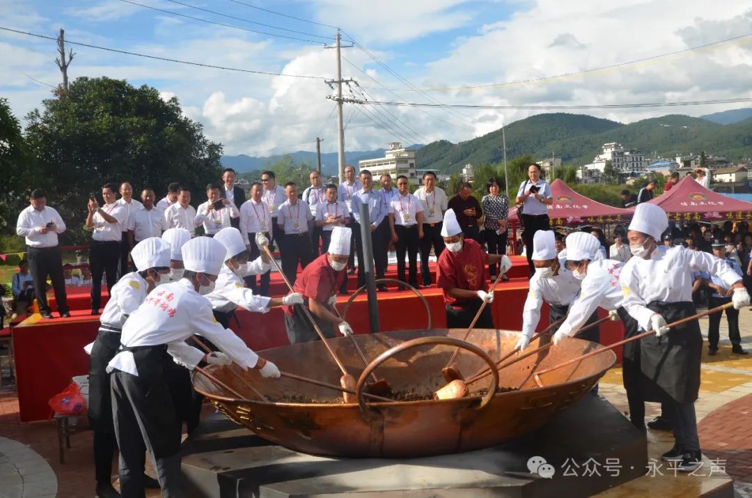 2018年9月19日,永平县炒制净重866市斤的“最大一锅黄焖鸡”,成功申报上海大世界基尼斯纪录 图源:“永平之声”微信公众号