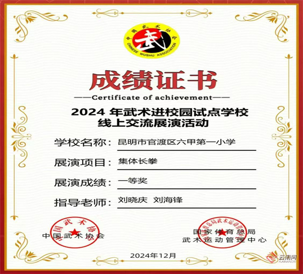 今年5月,官渡区六甲第一小学由国家体育总局武术运动管理中心认定为“武术进校园试点学校”,由云南省教育厅和云南省武术协会授牌,成为全国、云南省首批“武术进校园试点单位”试点学校。官渡区六甲第一小学作为国家级试点学校参加此次线上交流展演活动。