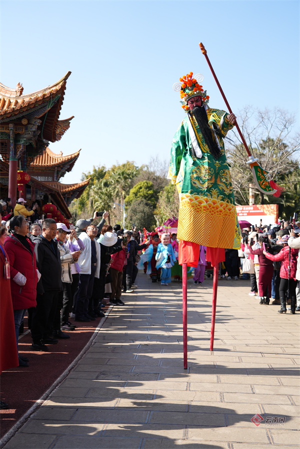 《迎新春拜大年》《彩云之南》等歌舞节目精彩纷呈,踩高跷、大头娃娃互动等民俗文化巡游引人入胜,呈贡区老年大学艺术团与斗南戏剧爱好者协会携手奉献的滇剧花灯综合演出底蕴深厚,昆明市民族歌舞剧院准备的民族团结专场演出表达着各民族对新春的美好祝愿。系列活动高潮迭起,现场人头攒动、掌声不断,旨在丰富节日生活,传承优秀文化,多角度展示“有一种叫云南的生活”。