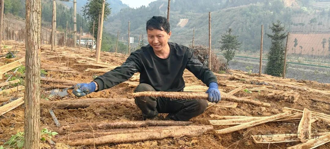 紫玉淮山山药还带动了周边群众就业。在采收现场,卢江林正和同伴们用手把一根根新鲜的紫山药从地里连着模具一块取出来。“家门口的工作不累,还能照顾家里,每年能挣到大概1万多块钱。” 卢江林说。据介绍,从紫山药的种植、施肥、除草开始,每天都需要一定的劳动力,仅采收阶段就吸纳了周边村寨近200人次的劳动力,为农户户均年增收超10000元。