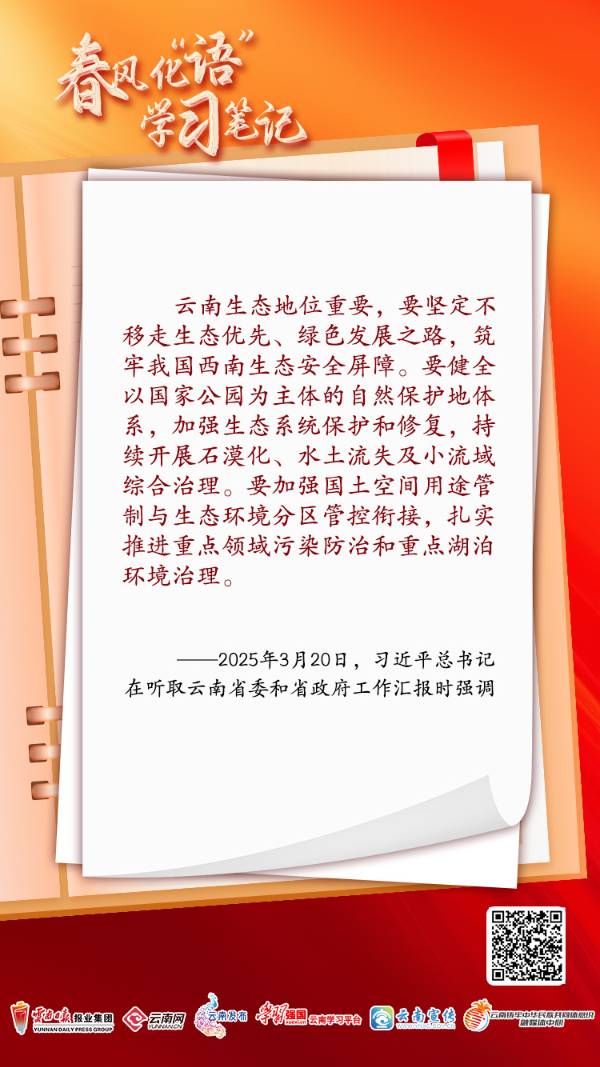 习近平指出,云南生态地位重要,要坚定不移走生态优先、绿色发展之路,筑牢我国西南生态安全屏障。要健全以国家公园为主体的自然保护地体系,加强生态系统保护和修复,持续开展石漠化、水土流失及小流域综合治理。要加强国土空间用途管制与生态环境分区管控衔接,扎实推进重点领域污染防治和重点湖泊环境治理。