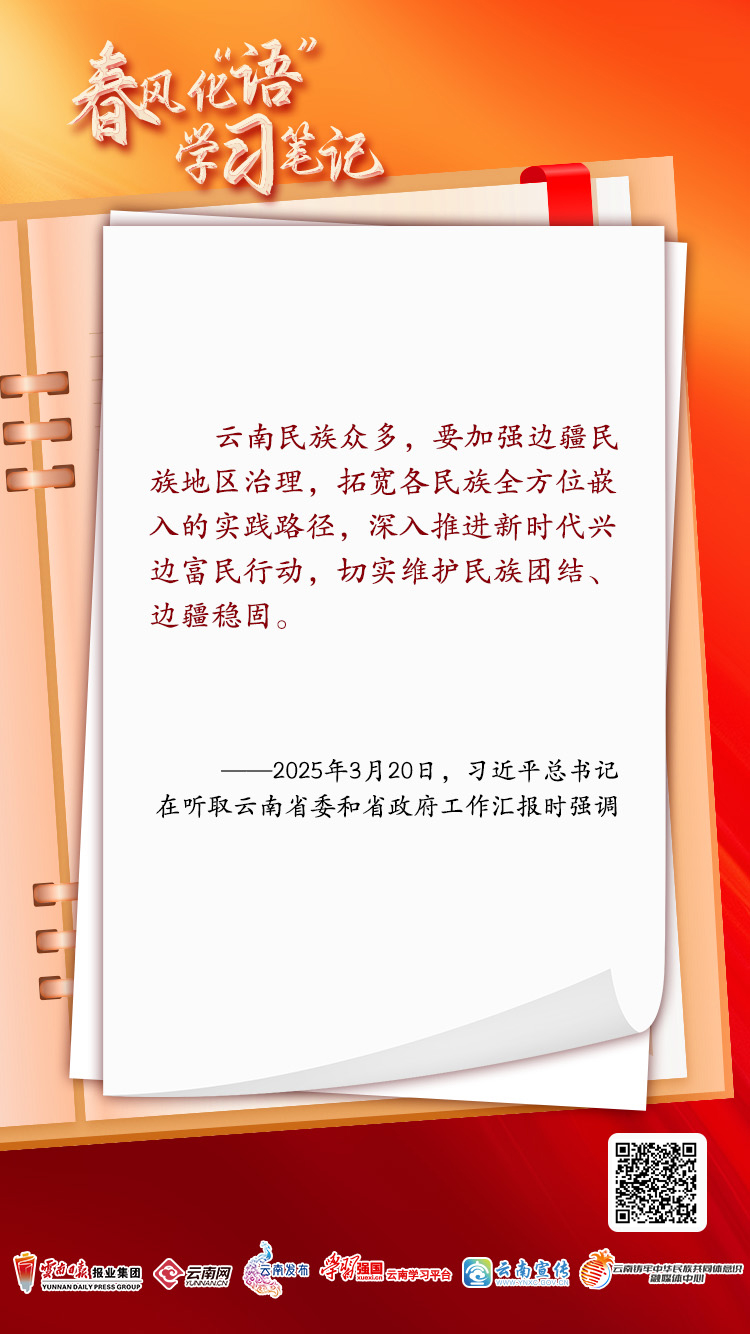 习近平强调,云南民族众多,要加强边疆民族地区治理,拓宽各民族全方位嵌入的实践路径,深入推进新时代兴边富民行动,切实维护民族团结、边疆稳固。