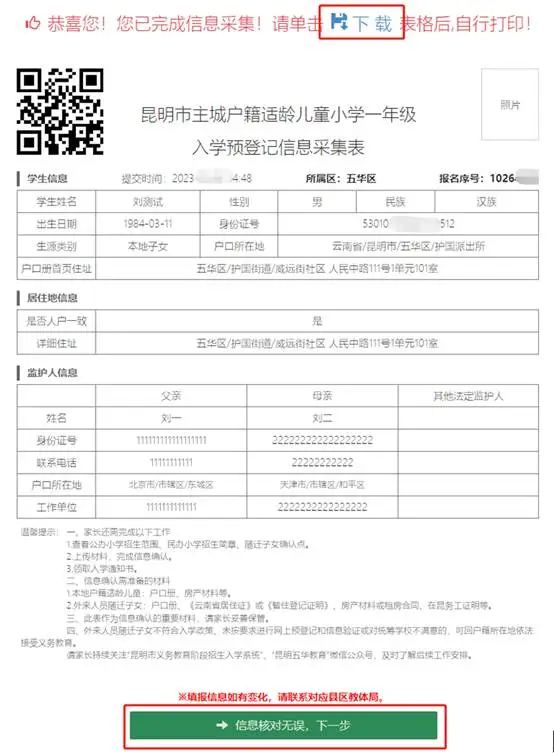 2.信息核对进入页面后,家长可查看核对和再次打印预登记信息表,确保预登记信息真实、准确、有效,如信息有误或发生变更的,可向所属区教育体育局提出修改申请。
