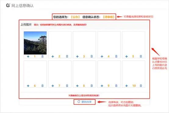 进入该页面说明您已经完成信息提交。在该页面中,一是可以查看选择的类型和信息审核状态;二是如接到学校或确认点反馈的要求,可以对已上传的图片进行修改或补充;三是家长如选择有误,可点击“撤销选择”按钮,重新选择。如下图所示: