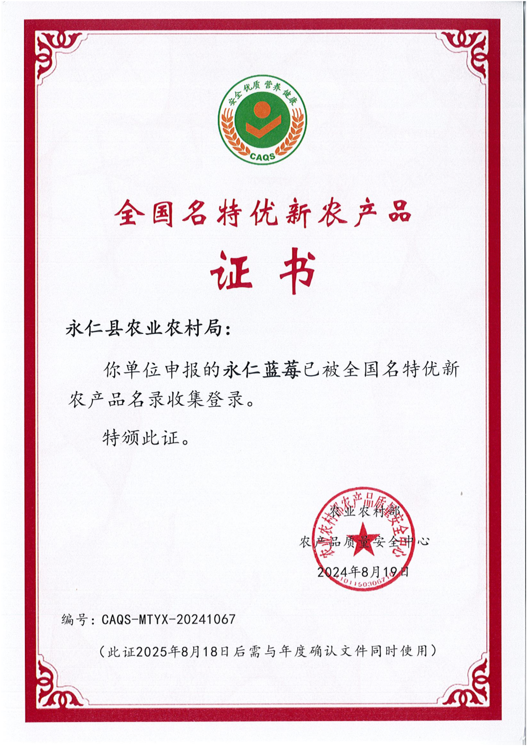 2024年,“永仁蓝莓”经农业农村部农产品质量安全中心评审认证、收集为“全国名特优新农产品”名录,成为全省蓝莓唯一入选产品。云南爱莓庄农业有限公司生产的爱莓庄蓝莓被纳入全国特质农产品名录。