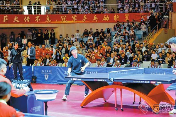 在云南师范大学实验中学,奥运冠军们与学校乒乓球队队员们进行了一场乒乓球友谊赛,为师生们上了一节“冠军体育课”。马龙还以《奋斗的青春,与祖国同行》为题,分享了自己的拼搏故事,鼓励青年学子们铭记西南联大的烽火岁月,将爱国情怀融入青春的奋斗中;用乒乓球这一“小球”转动“大梦想”,在各自的领域勇攀高峰。