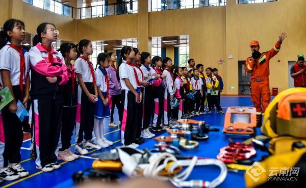 4月15日,在勐腊县,消防员为学生讲解绳索救援技能。方林 摄