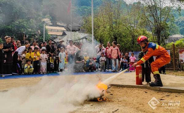 4月15日,在景迈山,消防员指导学生使用灭火器。陈浩 摄