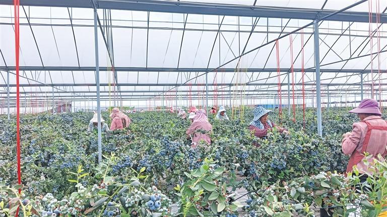 近日,记者走进麒麟区越州镇竹园生态蓝莓种植基地,只见工人手持小桶,在青枝绿叶间“游走”,将一颗颗饱满的蓝莓收入桶中。采摘后的蓝莓,经挑选、称重、装箱等工序后,将销往北京、上海、广东等地。