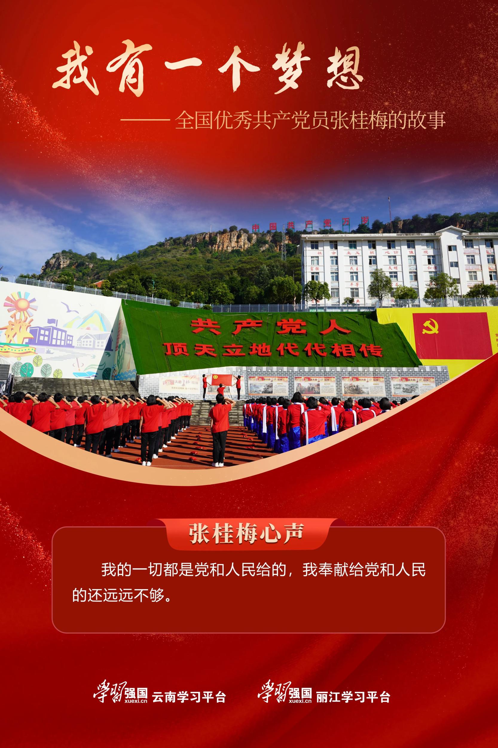编者按:全国优秀共产党员张桂梅扎根云南丽江华坪县四十余年,以“建一所全免费的女子高中,阻断贫困的代际传递”为使命,用教育点亮万千女孩的人生梦想。为弘扬榜样力量、激发全民阅读热情,“学习强国”云南学习平台联合“学习强国”丽江学习平台推出“书香传梦·聆听张桂梅”专题策划,由电台主播诵读《我有一个梦想——全国优秀党员张桂梅的故事》一书,向广大读者分享张桂梅扎根基层、无私奉献的感人事迹,以书为媒传递希望,凝聚奋进力量。