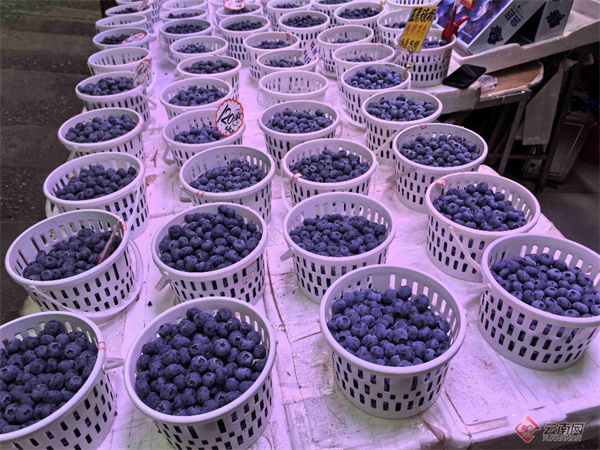 在昆明大观篆新农贸市场,记者观察到,“明星水果”蓝莓正在经历降价,每公斤价格在50—120元之间。摊主告诉记者,蓝莓一般从11月卖到次年5月,其中11月—次年3月期间的品质最好,口感脆甜,主产地为澄江、石林、建水。最贵的时候,大果要卖到200多元/公斤,普通的小果也要100多元/公斤。目前,蓝莓大果价格已降至120元/公斤,降价40%—50%。“这个季节上市的蓝莓品种和口感都不如之前,口感要偏软糯,少了一些脆感,所以价格也相对便宜一些。”摊主解释道。