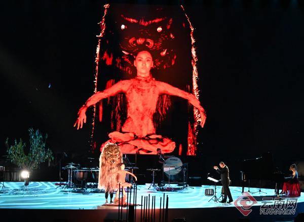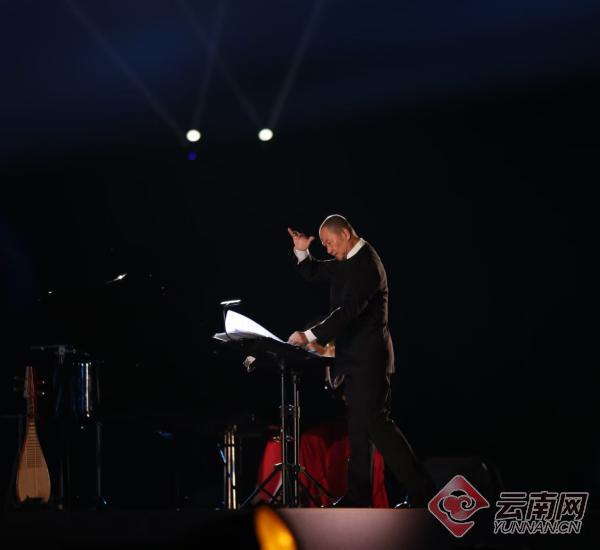 暮色四合,夕月初上。景迈茶马古窖建设工地临时搭建的舞台中央,国际著名指挥家、作曲家谭盾联袂纽约打击乐团和杨丽萍团队舞者,以千年茶山为幕、山风成谱,首演《“景迈山魂·万国茶会”谭盾音乐会》。音乐会融合经典打击乐、歌剧、舞剧、舞蹈、音乐等多种艺术形式,由“树”(《春之祭》)“鹿”(《九色鹿》)“人”(《茶马古道》)三个篇章组成,音画交响激活东方哲思,奏响文明交融促进“珍爱地球 人与自然和谐共生”的永恒主题。此次演出既是东西方美学的融合交流与创新呈现,更是用当代艺术语言对“天地人神”关系的重新解构与茶语重构。