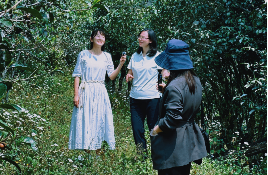 云南广播电视台主持人卢凌杰(左一)在兔街镇的茶园里采访王白娟院长