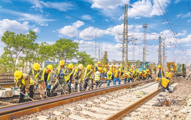 沪昆铁路曲靖站作为入滇的关键节点,承担着繁重的运输任务,因线路列车通过密度高、调车作业频繁,道床、轨枕以及钢轨长期承受较大压力,磨损情况较为严重。为全面提升铁路线路质量,及时消除潜在安全隐患,同时有效应对“五一”假期客流高峰,曲靖工务段提前研判安全风险,科学制定施工方案,严控施工各个环节,确保线路质量动态达标。