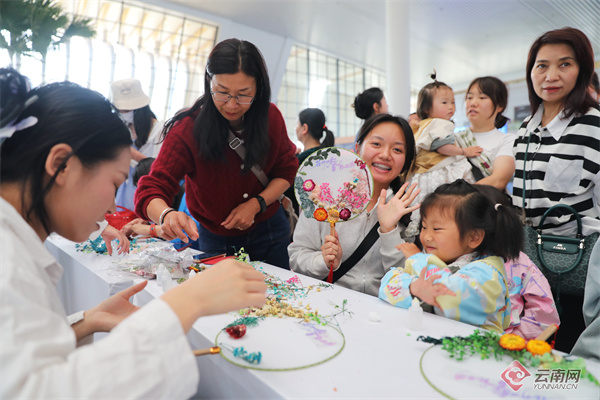 活动最后,主持人带领旅客参与鲜花文创产品制作,并品尝鲜花饼、花茶。在制作干花团扇的过程中,旅客们沉浸式感受“花样生活”,手中的团扇不仅成为了精美的纪念品,更承载着云南鲜花的浪漫与美好。