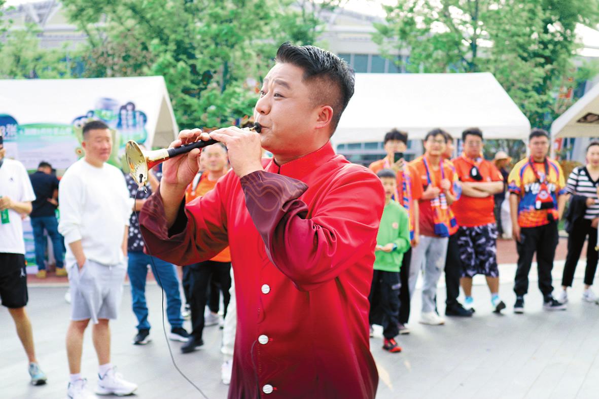 演出以器乐演奏的形式进行,在极具代表性的唢呐名曲《百鸟朝凤》中拉开序幕。唢呐声声,仿佛百鸟齐鸣,瞬间吸引众多球迷驻足观看。玉溪市滇剧院的演职人员以其精湛的技艺,通过生动的音乐语言模仿百鸟争鸣的自然景象,将民间音乐与自然万物的和谐共生展现得淋漓尽致,赢得了现场观众的阵阵掌声。