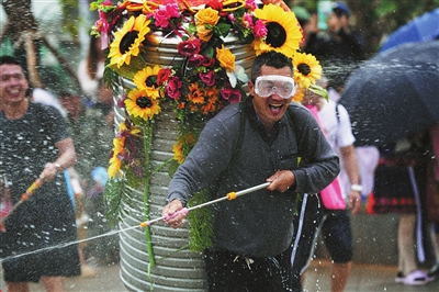 12时30分,万众期待的万人泼水狂欢开启。广场化作欢乐的海洋,水花四溅,欢声雷动。参与者手持水盆、水枪等工具,将祝福之水泼向身旁的每一个人。来自昆明的游客刘月兴奋地说:“这是我首次体验金平泼水节,身处其间让我感到无比快乐。”