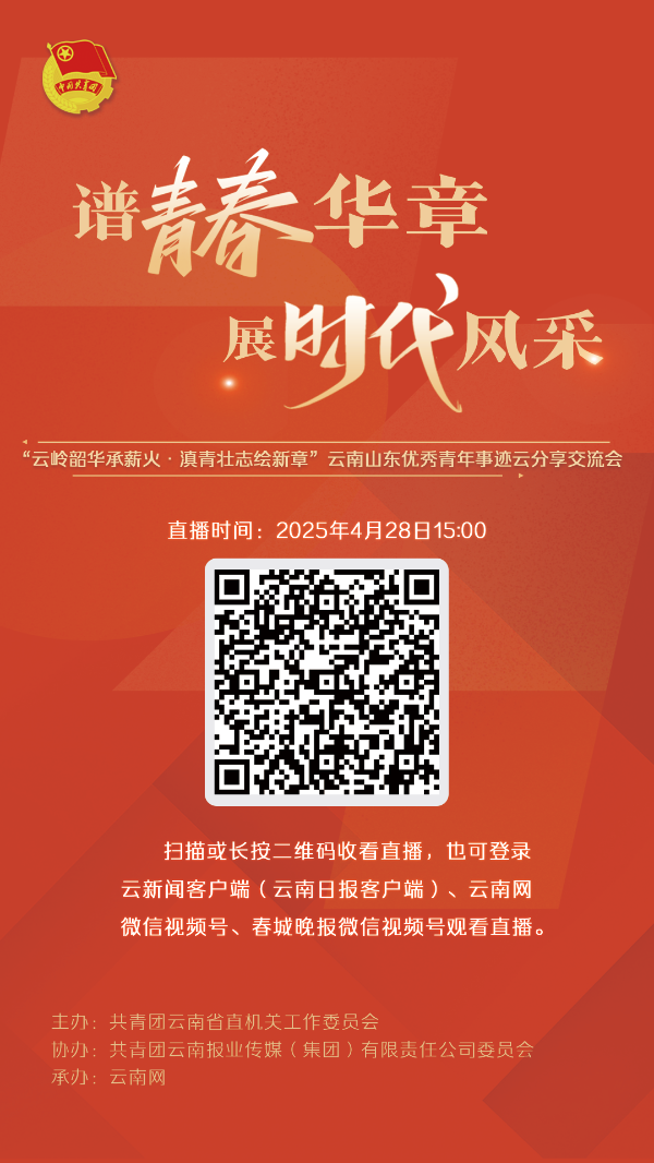 4月28日15时起,云南日报、云南网、春城晚报三大媒体的微信视频号将联袂对该场分享交流会进行全程直播。云南青年和山东青年将以“隔空对话”的网络直播形式,全景展现新时代青年的使命担当和精神风貌。观众只需关注上述三个微信公众号中的一个,即可收看视频号直播;也可以扫描下方二维码进直播间观看。
