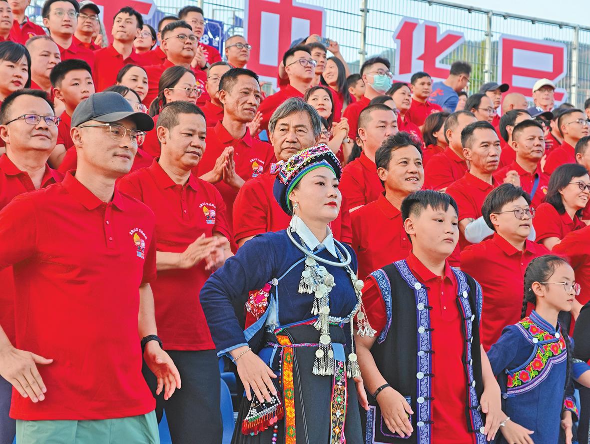当夕阳为云南玉溪高原体育运动中心主体育场镀上金边,由各级劳动模范、道德模范、乡镇(街道)基层工作者、产业工人、金融从业者及旅居群众等组成的观赛团亮相公益看台。在开赛前的暖场环节,《芒果Mango》《元江美食指南》等来自热情元江的原创音乐响起,劳动者方阵配合着明快律动的节奏,以欢快的舞蹈点燃全场2万余名观众的观赛热情,将劳动者风采和热情元江儿女特有的活力与热忱展示得淋漓尽致。