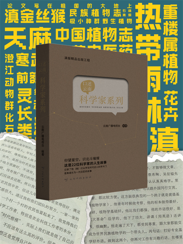 为弘扬科学家精神,用新时代科学家精神铸魂育人,云南广播电视台于2023年推出22集系列短视频《口述云南·科学家系列》,为云南科学家建立珍贵的影像库。在此基础上,云南广播电视台与云南科技出版社合作,编撰而成《口述云南——科学家系列》书籍,该书以22位云南生态文明建设方面的科学家口述访谈为主要内容,讲述了他们的成长和奋斗历程,字里行间,饱含着他们对祖国的热爱和对人民的深情,彰显了他们勇于攀登科学高峰、敢于创新的精神,体现出他们严谨治学、淡泊名利、甘于奉献的高尚情操。这是22位科学家的人生故事,更是科学家精神内涵的集中体现。