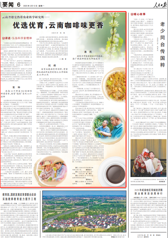 习近平总书记考察云南时指出,“云南咖啡还是代表着中国的”。云南咖啡种植面积和产量均占全国的98%以上,2024年出口量达3.25万吨,同时形成了从种植、加工到体验、消费的咖啡全产业链条。产业兴旺背后,离不开种质资源的培育。近日,本报记者走进云南省德宏热带农业科学研究所,记录科研人员选育咖啡良种、创新田间管理、对接技术需求的生动故事。