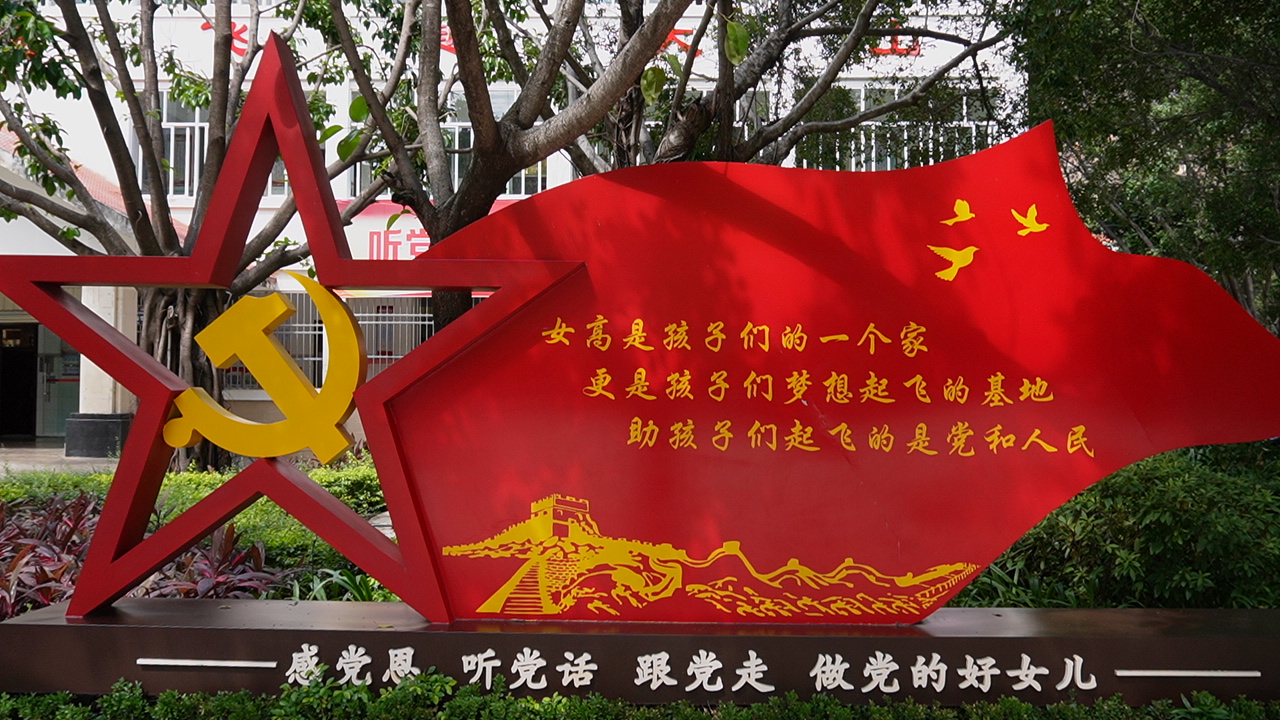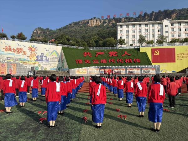 在华坪女高,红色文化融入了校园生活的各方面。党员教师佩戴党员徽章上课;每周组织开展一次党性教育;高一新生入学第一课是爱国主义教育;课间操唱红歌、跳红色舞蹈也早已成为传统……
