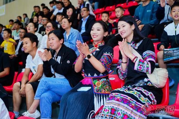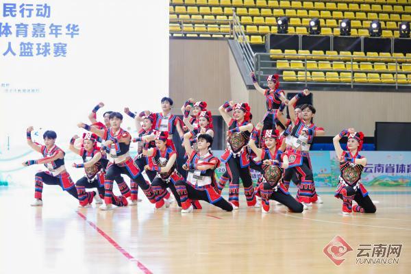 24日晚,夜幕降临,锣鼓声响,25支云南边境县(市)的篮球代表队应声入场亮相,他们斗志昂扬又热情似火。启动仪式展演在《同心共筑中国梦》的旋律中拉开帷幕,舞者身着各民族盛装跳起动感的健身操,用舞步生动诠释“中华民族一家亲”。女子群舞《悠悠锭声》中十余位黑傣姑娘“顶着房子”拨动锭弦,表情舒展自豪,跳出了新时代边境线上傣族人家的幸福生活新气象;彝族阿哥阿妹则踏着铿锵的鼓点跳动《彝家心弦》,跺脚、踢腿声如春雷滚过,动作利落如刀削劲竹,将边疆儿女投身兴边富民的决心和劲头倾情演绎。