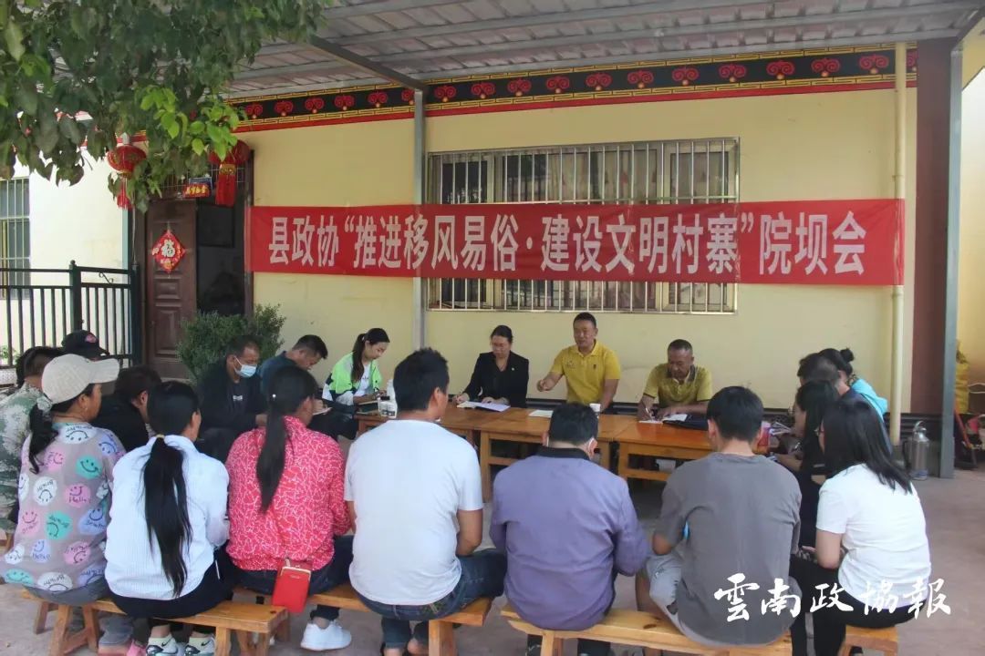 如何更好地推进文明村寨示范建设,打造全国样板?漾濞县政协在深入调研的基础上,决定以院坝协商议事会为抓手,广泛凝聚共识,推动问题解决。2023年5月,漾濞县政协在龙潭乡召开了以“推进移风易俗,建设文明村寨”为议题的院坝协商议事会议,群策群力探讨建设文明乡村新路径;2023年8月,县政协在龙潭乡密古村召开了以“推进基层依法治理,建设绿美幸福村庄”为议题的院坝协商议事会议,围绕乡村治理短板,达成以党建为引领,完善村民监督委员会、红白理事会等自治组织,将矛盾调解、移风易俗、人居环境提升、文化生活丰富、基层民主法治创建等工作,与“八五”普法规划有机结合等多项共识。
