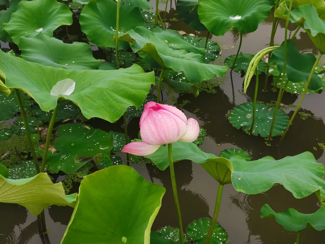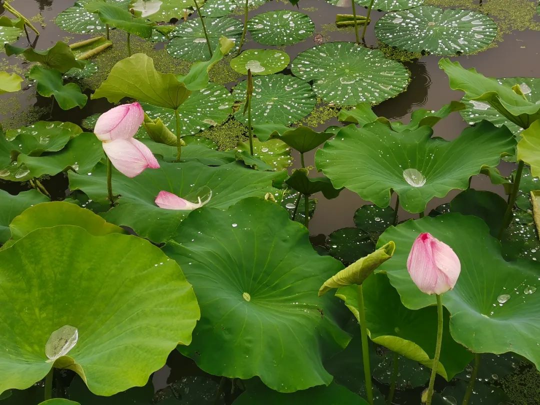 “春看碧野、夏赏荷景、秋览丰收、冬观湿地。”三川的四时美景,早已闻名遐迩。初夏的时节,荷田中,层层叠叠的全是荷叶,尖尖的荷角与菡萏一同长成,“长子打把伞,矮子戴朵花。”不蔓不枝,香远益清的荷叶,在泛起清清涟漪的水中,雨露均沾。“小荷才露尖尖角,早有蜻蜓立上头。”亭亭玉立的荷叶,仙姿佚貌。宛若小家碧玉,秀外慧中。