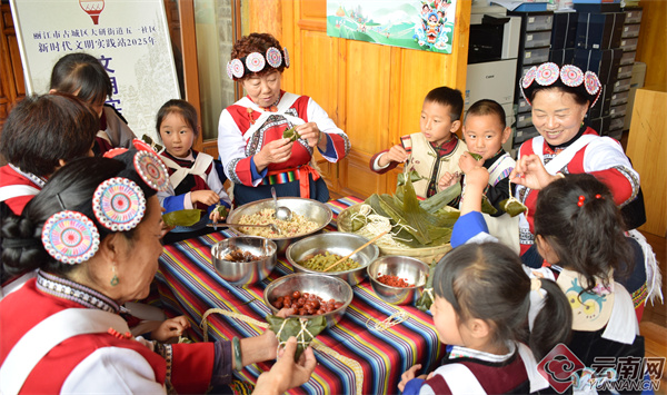 当天,丽江市古城区大研街道五一社区新时代文明实践站也同步开展端午文明实践活动,志愿者手把手教孩子们包粽子、制作艾草香囊、系五彩绳。小手翻飞间,传统文化的种子悄然在孩子们心中生根发芽。