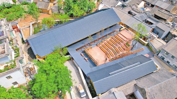 白雾书局原址上是两座始建于清代的粮仓,历经沧桑的墙体风化严重。如何在保留传统村落韵味的同时为书店注入当代文化的灵魂,建筑师刘家琨给出了自己的答案:“用竹钢在危房内部嵌套全新结构,辅以金色漆涂抹的夯土外墙,在保留原有韵味的同时加强外部的视觉冲击力。金色既是会泽铜矿史的物质隐喻,也是对‘书中自有黄金屋’的精神解构。”
