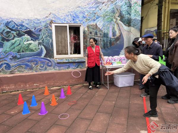 除了精彩演出,“粽”头戏游园会在众人的期待中有序进行,“蒙眼摸粽子”吸引了众多居民参与。参与者蒙上双眼,在现场观众的善意提示下,小心翼翼地沿路线摸索前进,努力寻找指定位置悬挂的粽子模型;传统蹴鞠项目前也排起了长队,居民们瞄准球洞,鼓足力气将球踢进去;“五毒消消乐”不仅考验着大家的手眼协调能力和反应速度,还让居民们对端午传统习俗中“五毒”的形象有了更深刻的认识,现场居民们争分夺秒,专注地拼着图案。