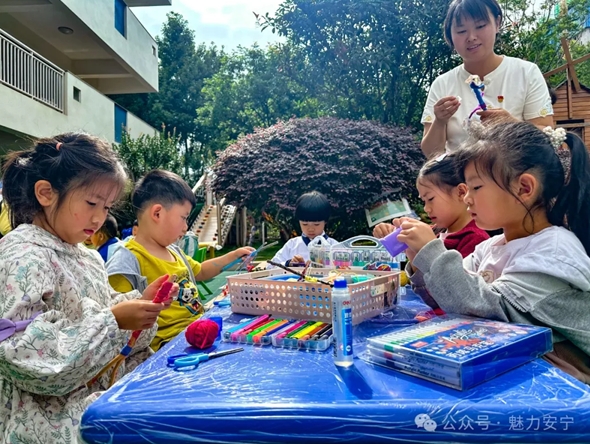 安宁市第一幼儿园开展了“畅享欢乐六一 成就美好童年”系列活动。在“趣玩自然物”首站活动中,孩子们以树叶、玉米叶、石头、树枝等为材料,尽情发挥想象力进行绘画与创作。教师团队寓教于乐,既帮助孩子们提升绘画技法,更引导他们在艺术实践中感悟自然之美、树立环保意识。