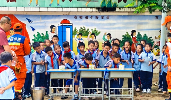 在思茅港镇橄榄坝小学,消防员组织学生开展“四渡赤水”游戏。图片来源于新华网